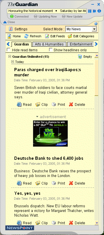 The Guardian has launched a branded RSS reader called NewsPoint in conjunction with Consenda, a software company based in the United States and Switzerland. The Windows XP application requires a username and password — separate from the Guardian’s somewhat disjointed registration system — and comes preloaded with Guardian RSS news and advertising feeds. NewsPoint is still “beta software” and has a few bugs, including some HTML entity parsing problems. It claims to interact “with an ordinary Web browser,” but ignored my Firefox preference and instead launched Internet Explorer, which many of us avoid for (…)