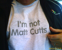 Since I'm in Silicon Valley this week, working a mere mile or two from Google's headquarters (I'm sitting in Microsoft's cafeteria) I wanted to make sure no one confused me and Matt Cutts (Google's top blogger) together, so that's the shirt I'm wearing today. Thanks Matt! (great branding, by the way).